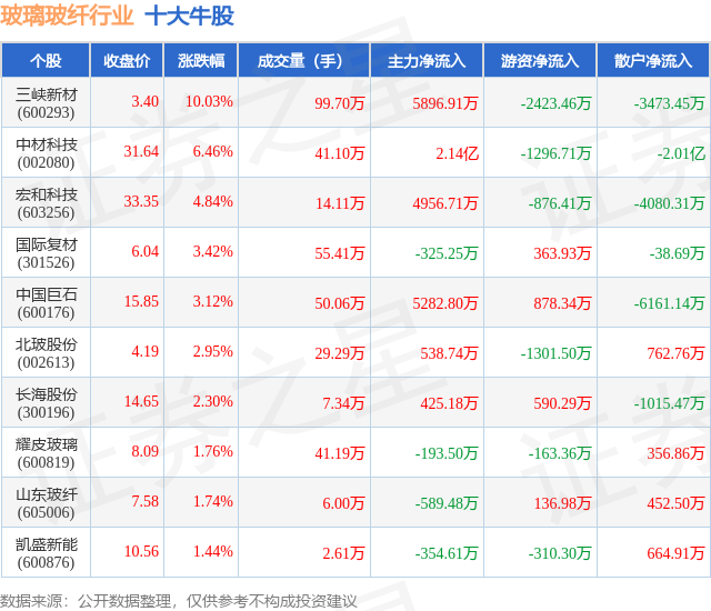 个股表现方面,玻璃玻纤行业当日领涨股为三峡新材(600293),该股当日报收3.4,上涨10.03%,成交量99.7万,主力资金净流入5896.91万元。中材科技(002080)以上涨6.46%紧随其后,该股当日成交量41.1万,主力资金净流入2.14亿元。除此之外,宏和科技(603256)、国际复材(301526)、中国巨石(600176)均进入当日牛股之列。具体个股列表见下表: