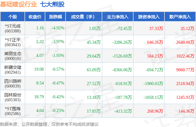 个股表现方面,基础建设行业当日领跌股为*ST元成(603388),该股当日报收1.16,下跌4.92%,成交量1.05万,主力资金净流出72.45万元。*ST正平(603843)以下跌3.97%紧随其后,该股当日成交量45.34万,主力资金净流出3286.26万元。除此之外,美丽生态(000010)、新疆交建(002941)、四川路桥(600039)均进入当日熊股之列。具体个股列表见下表: