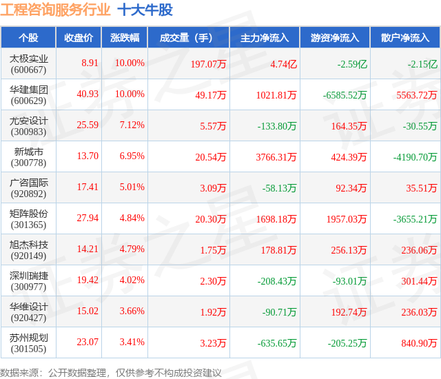 个股表现方面,工程咨询服务行业当日领涨股为太极实业(600667),该股当日报收8.91,上涨10.0%,成交量197.07万,主力资金净流入4.74亿元。华建集团(600629)以上涨10.0%紧随其后,该股当日成交量49.17万,主力资金净流入1021.81万元。除此之外,尤安设计(300983)、新城市(300778)、广咨国际(920892)均进入当日牛股之列。具体个股列表见下表:
