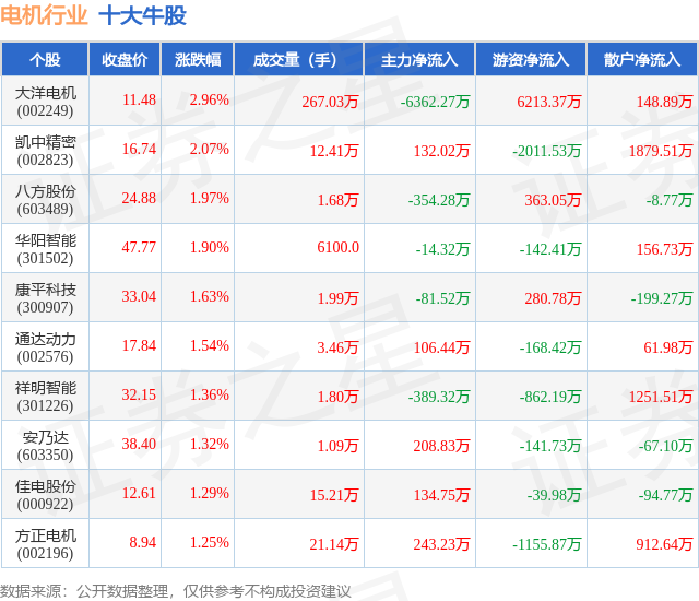 个股表现方面,电机行业当日领涨股为大洋电机(002249),该股当日报收11.48,上涨2.96%,成交量267.03万,主力资金净流出6362.27万元。凯中精密(002823)以上涨2.07%紧随其后,该股当日成交量12.41万,主力资金净流入132.02万元。除此之外,八方股份(603489)、华阳智能(301502)、康平科技(300907)均进入当日牛股之列。具体个股列表见下表: