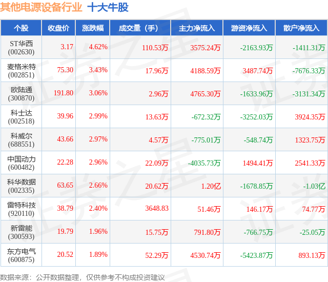 个股表现方面,其他电源设备行业当日领涨股为ST华西(002630),该股当日报收3.17,上涨4.62%,成交量110.53万,主力资金净流入3575.24万元。麦格米特(002851)以上涨3.43%紧随其后,该股当日成交量17.96万,主力资金净流入4188.59万元。除此之外,欧陆通(300870)、科士达(002518)、科威尔(688551)均进入当日牛股之列。具体个股列表见下表: