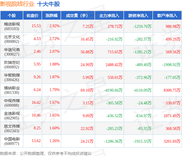 个股表现方面,影视院线行业当日领涨股为横店影视(603103),该股当日报收15.53,上涨2.92%,成交量7.25万,主力资金净流入278.72万元。北京文化(000802)以上涨2.72%紧随其后,该股当日成交量16.45万,主力资金净流出216.92万元。除此之外,华谊兄弟(300027)、欢瑞世纪(000892)、华智数媒(300426)均进入当日牛股之列。具体个股列表见下表: