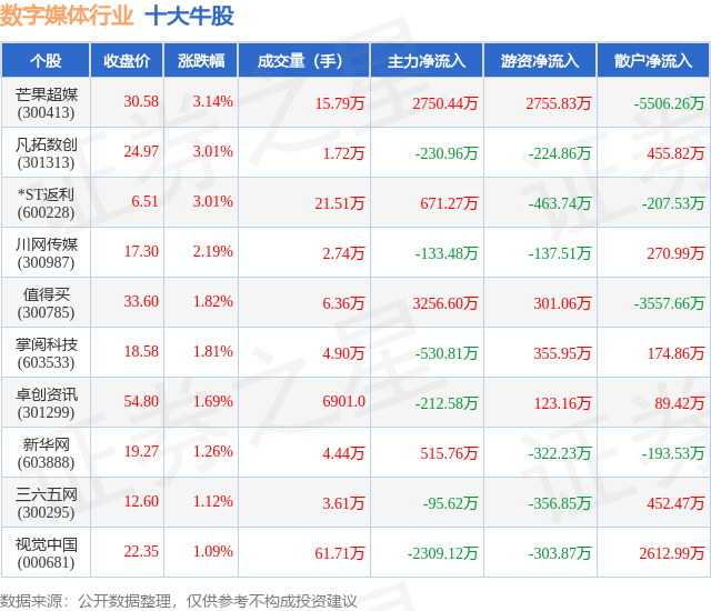 个股表现方面,数字媒体行业当日领涨股为芒果超媒(300413),该股当日报收30.58,上涨3.14%,成交量15.79万,主力资金净流入2750.44万元。凡拓数创(301313)以上涨3.01%紧随其后,该股当日成交量1.72万,主力资金净流出230.96万元。除此之外,*ST返利(600228)、川网传媒(300987)、值得买(300785)均进入当日牛股之列。具体个股列表见下表: