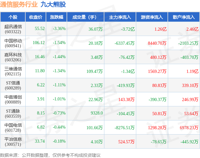 个股表现方面,通信服务行业当日领跌股为超讯通信(603322),该股当日报收55.52,下跌3.36%,成交量36.07万,主力资金净流出3.72亿元。中国移动(600941)以下跌1.54%紧随其后,该股当日成交量20.18万,主力资金净流出6337.45万元。除此之外,嘉环科技(603206)、三维通信(002115)、ST信通(600289)均进入当日熊股之列。具体个股列表见下表: