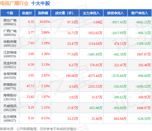 个股表现方面,电视广播行业当日领涨股为湖北广电(000665),该股当日报收6.35,上涨10.05%,成交量97.33万,主力资金净流入1.68亿元。广西广电(600936)以上涨3.86%紧随其后,该股当日成交量32.71万,主力资金净流入1922.02万元。除此之外,华数传媒(000156)、江苏有线(600959)、流金科技(920021)均进入当日牛股之列。具体个股列表见下表: