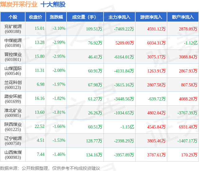 个股表现方面,煤炭开采行业当日领跌股为兖矿能源(600188),该股当日报收15.01,下跌3.1%,成交量109.51万,主力资金净流出7469.22万元。中煤能源(601898)以下跌2.99%紧随其后,该股当日成交量76.92万,主力资金净流入5209.09万元。除此之外,晋控煤业(601001)、山煤国际(600546)、兰花科创(600123)均进入当日熊股之列。具体个股列表见下表: