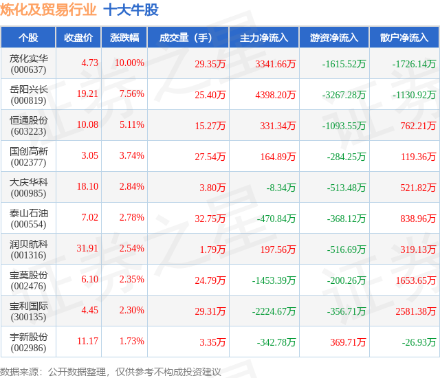 个股表现方面,炼化及贸易行业当日领涨股为茂化实华(000637),该股当日报收4.73,上涨10.0%,成交量29.35万,主力资金净流入3341.66万元。岳阳兴长(000819)以上涨7.56%紧随其后,该股当日成交量25.4万,主力资金净流入4398.2万元。除此之外,恒通股份(603223)、国创高新(002377)、大庆华科(000985)均进入当日牛股之列。具体个股列表见下表: