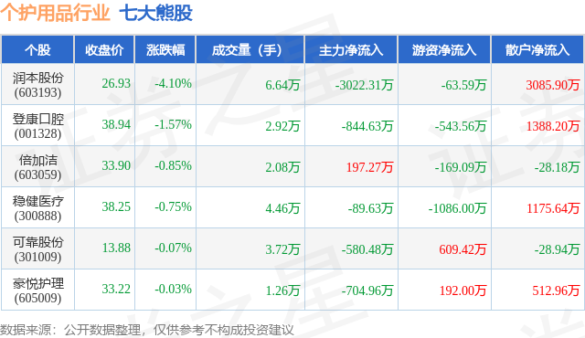个股表现方面,个护用品行业当日领跌股为润本股份(603193),该股当日报收26.93,下跌4.1%,成交量6.64万,主力资金净流出3022.31万元。登康口腔(001328)以下跌1.57%紧随其后,该股当日成交量2.92万,主力资金净流出844.63万元。除此之外,倍加洁(603059)、稳健医疗(300888)、可靠股份(301009)均进入当日熊股之列。具体个股列表见下表:
