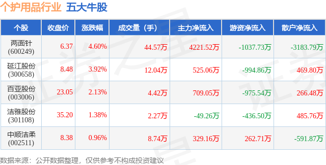 个股表现方面,个护用品行业当日领涨股为两面针(600249),该股当日报收6.37,上涨4.6%,成交量44.57万,主力资金净流入4221.52万元。延江股份(300658)以上涨3.92%紧随其后,该股当日成交量12.04万,主力资金净流入525.06万元。除此之外,百亚股份(003006)、洁雅股份(301108)、中顺洁柔(002511)均进入当日牛股之列。具体个股列表见下表: