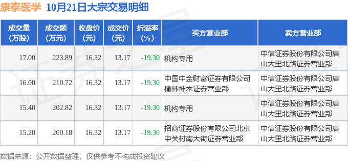 证券之星消息,10月21日康泰医学发生大宗交易,交易数据如下: