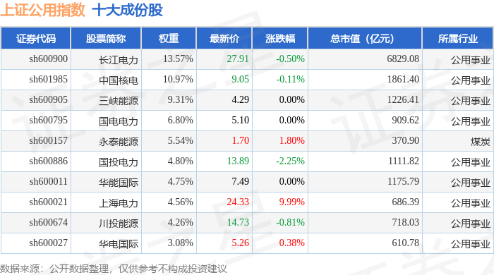 证券之星消息,10月21日,上证公用(000041)指数报收于2627.45点,涨0.53%,成交158.88亿元,换手率0.97%。当日该指数成份股中,上涨的有17家,上海电力以9.99%的涨幅领涨,下跌的有9家,国投电力以2.25%的跌幅领跌。