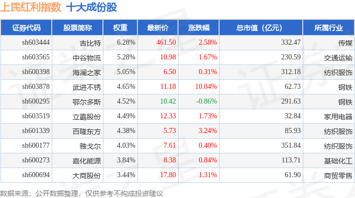 证券之星消息,10月21日,上民红利(000153)指数报收于3187.19点,涨1.45%,成交45.83亿元,换手率0.93%。当日该指数成份股中,上涨的有23家,武进不锈以10.04%的涨幅领涨,下跌的有7家,东方环宇以1.57%的跌幅领跌。