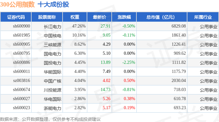 300公用(000917)指数十大成份股详情如下:
