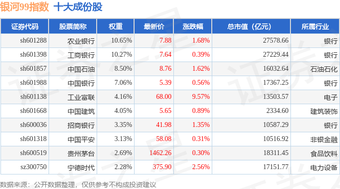 证券之星消息,10月21日,银河99(000959)指数报收于8028.74点,涨1.27%,成交3232.07亿元,换手率0.46%。当日该指数成份股中,上涨的有69家,新易盛以10.99%的涨幅领涨,下跌的有24家,小商品城以2.23%的跌幅领跌。