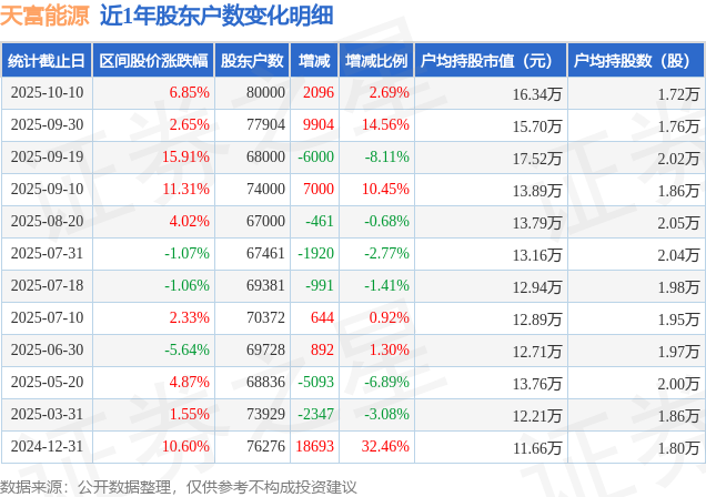 证券之星消息,近日天富能源披露,截至2025年10月10日公司股东户数为8.0万户,较9月30日增加2096.0户,增幅为2.69%。户均持股数量由上期的1.76万股减少至1.72万股,户均持股市值为16.34万元。