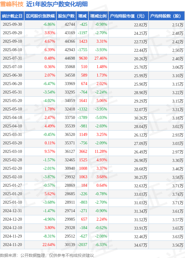 从股价来看,2025年9月20日至2025年9月30日,雪峰科技区间跌幅为6.86%,在此期间股东户数减少425.0户,减幅为0.98%。