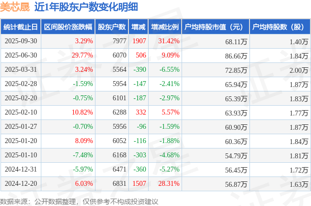 证券之星消息,近日美芯晟披露,截至2025年9月30日公司股东户数为7977.0户,较6月30日增加1907.0户,增幅为31.42%。户均持股数量由上期的1.84万股减少至1.4万股,户均持股市值为68.11万元。