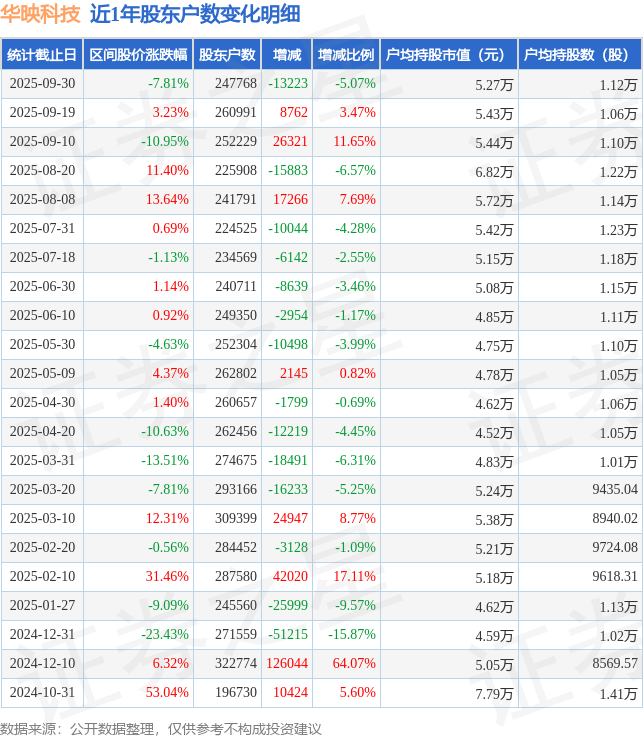 从股价来看,2025年9月19日至2025年9月30日,华映科技区间跌幅为7.81%,在此期间股东户数减少1.32万户,减幅为5.07%。