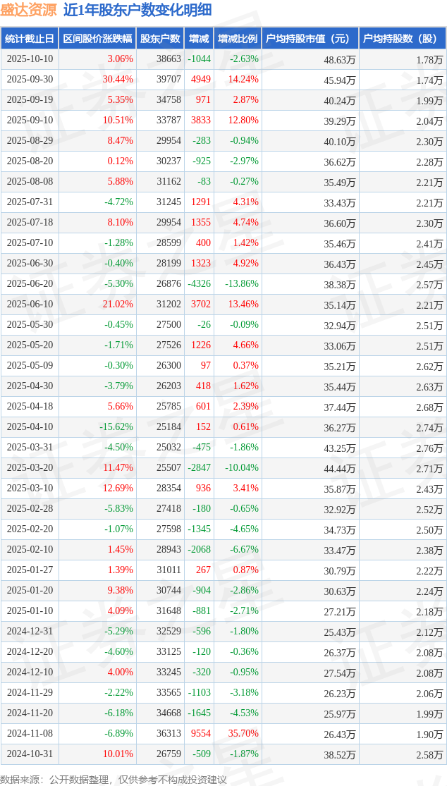 证券之星消息,近日盛达资源披露,截至2025年10月10日公司股东户数为3.87万户,较9月30日减少1044.0户,减幅为2.63%。户均持股数量由上期的1.74万股增加至1.78万股,户均持股市值为48.63万元。