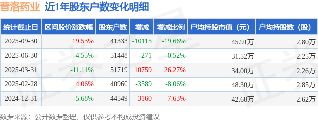从股价来看,2025年6月30日至2025年9月30日,普洛药业区间涨幅为19.53%,在此期间股东户数减少1.01万户,减幅为19.66%。