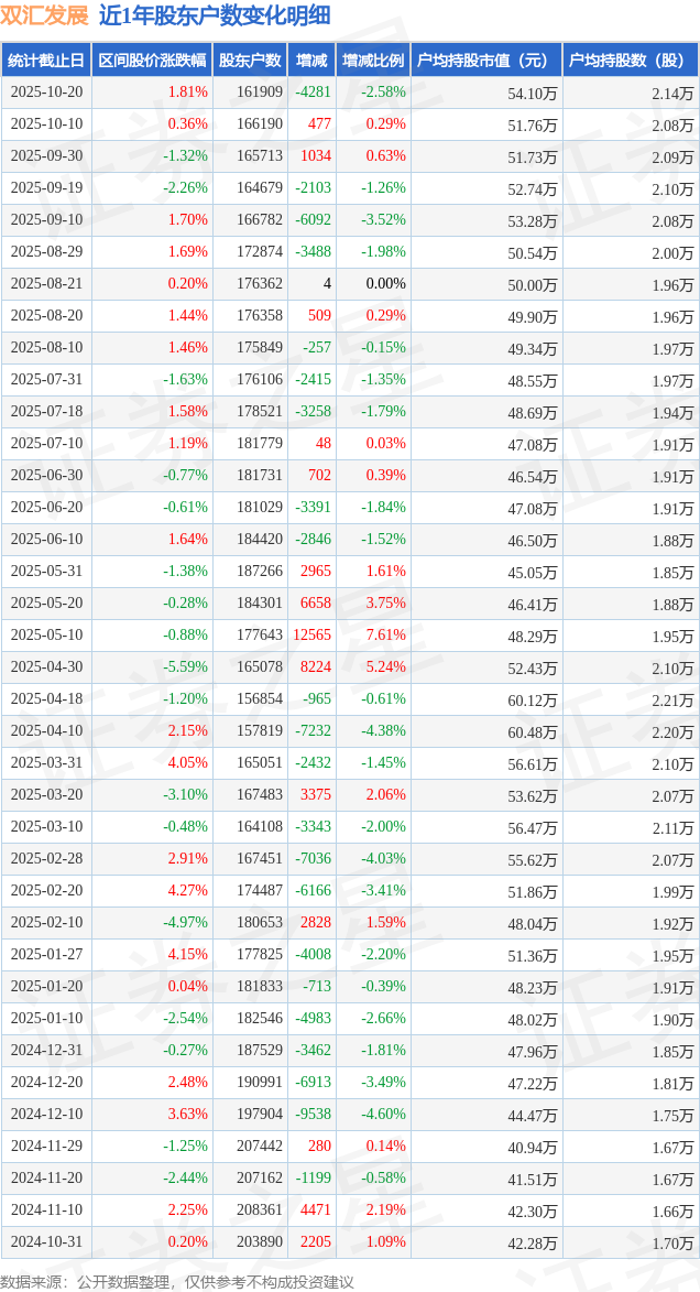 从股价来看,2025年10月10日至2025年10月20日,双汇发展区间涨幅为1.81%,在此期间股东户数减少4281.0户,减幅为2.58%。