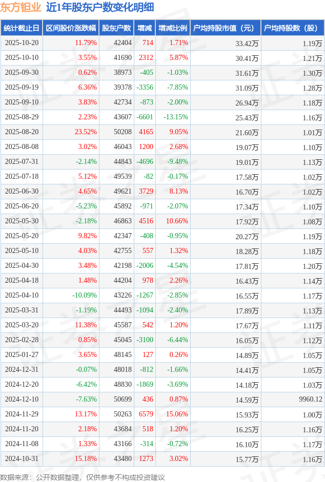 从股价来看,2025年10月10日至2025年10月20日,东方钽业区间涨幅为11.79%,在此期间股东户数增加714.0户,增幅为1.71%。