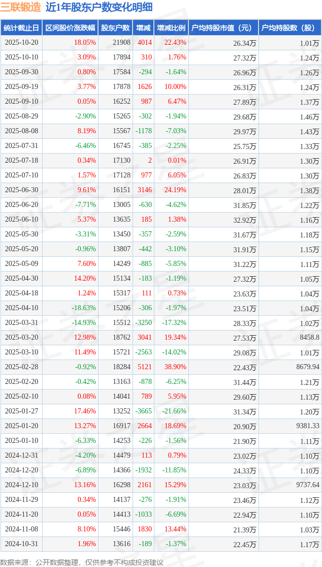 从股价来看,2025年10月10日至2025年10月20日,三联锻造区间涨幅为18.05%,在此期间股东户数增加4014.0户,增幅为22.43%。