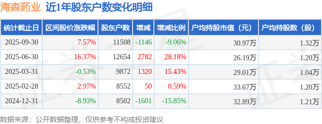 从股价来看,2025年6月30日至2025年9月30日,海森药业区间涨幅为7.57%,在此期间股东户数减少1146.0户,减幅为9.06%。