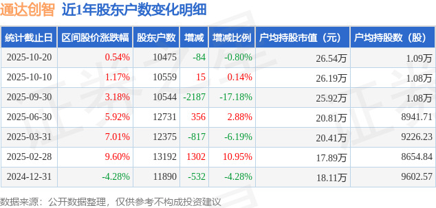 从股价来看,2025年10月10日至2025年10月20日,通达创智区间涨幅为0.54%,在此期间股东户数减少84.0户,减幅为0.8%。