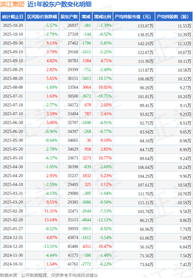 从股价来看,2025年10月10日至2025年10月20日,滨江集团区间跌幅为5.57%,在此期间股东户数减少381.0户,减幅为1.39%。