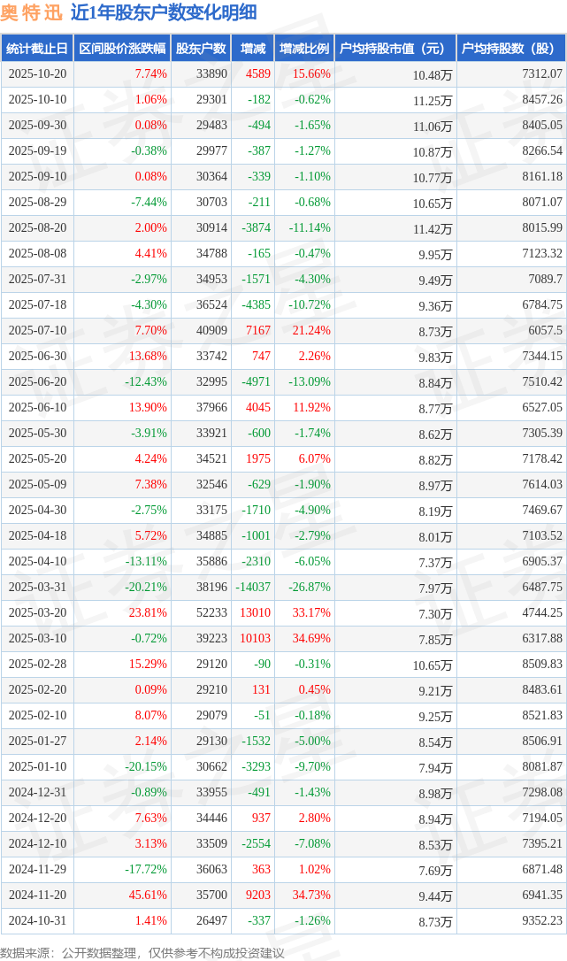从股价来看,2025年10月10日至2025年10月20日,奥 特 迅区间涨幅为7.74%,在此期间股东户数增加4589.0户,增幅为15.66%。