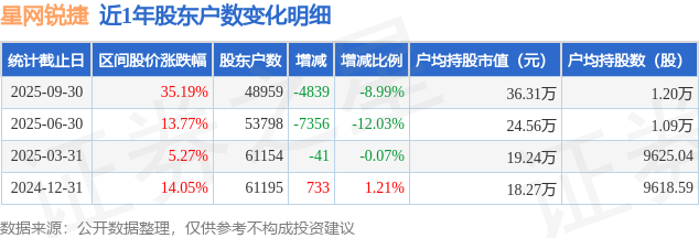 从股价来看,2025年6月30日至2025年9月30日,星网锐捷区间涨幅为35.19%,在此期间股东户数减少4839.0户,减幅为8.99%。