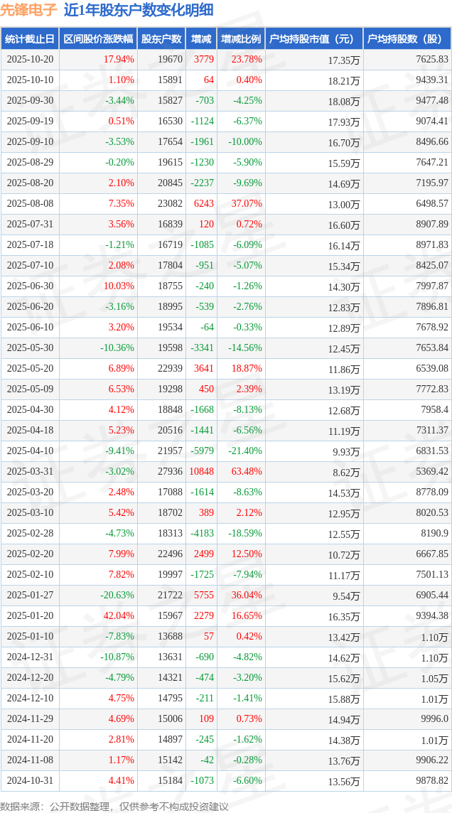 从股价来看,2025年10月10日至2025年10月20日,先锋电子区间涨幅为17.94%,在此期间股东户数增加3779.0户,增幅为23.78%。