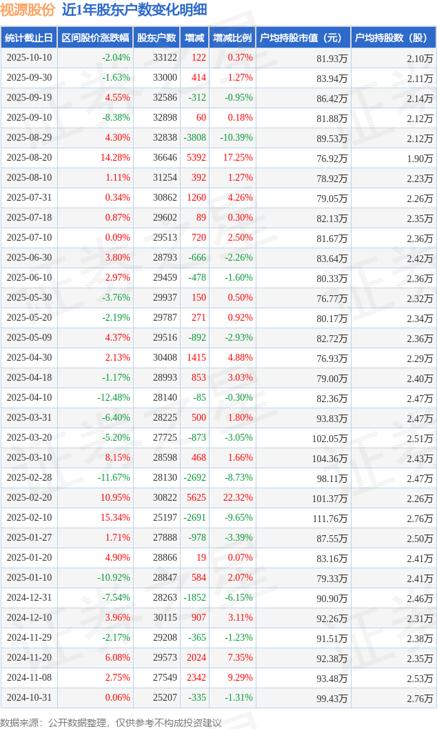 从股价来看,2025年9月30日至2025年10月10日,视源股份区间跌幅为2.04%,在此期间股东户数增加122.0户,增幅为0.37%。