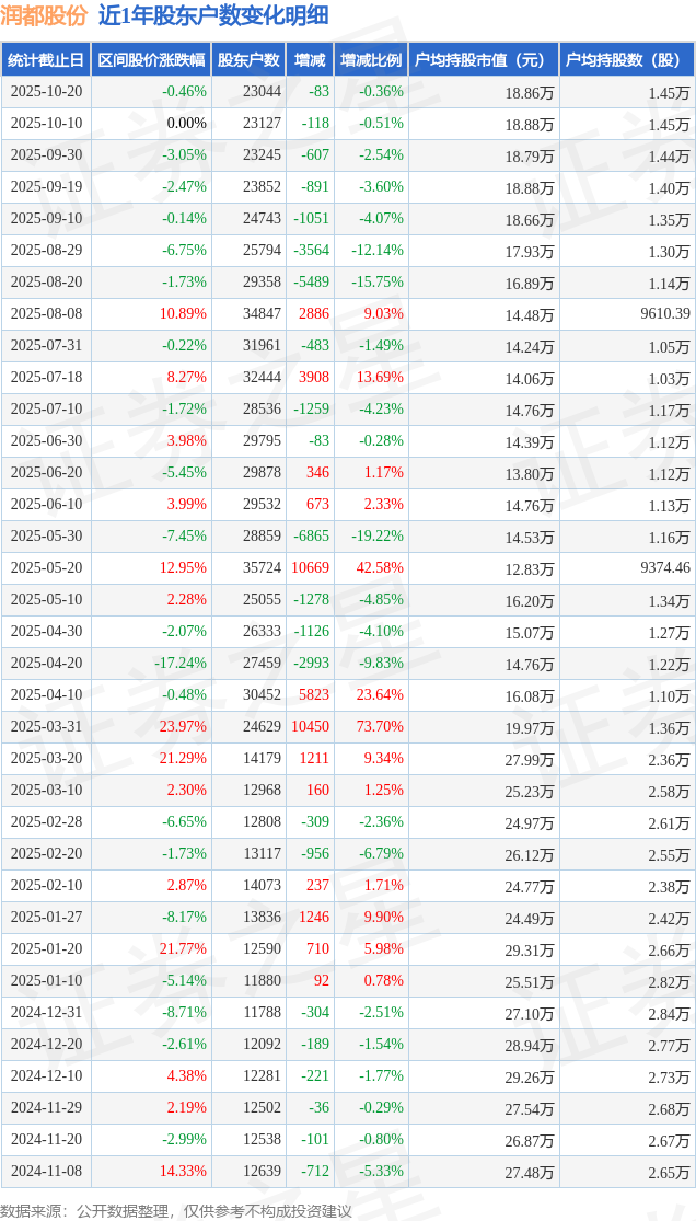 从股价来看,2025年10月10日至2025年10月20日,润都股份区间跌幅为0.46%,在此期间股东户数减少83.0户,减幅为0.36%。