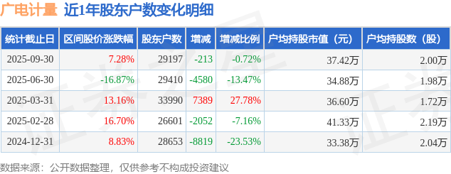 从股价来看,2025年6月30日至2025年9月30日,广电计量区间涨幅为7.28%,在此期间股东户数减少213.0户,减幅为0.72%。