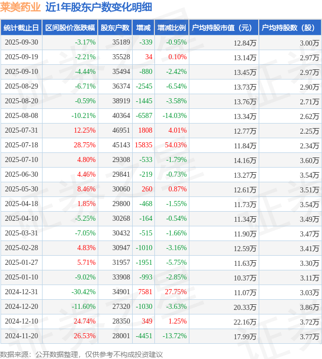 从股价来看,2025年9月20日至2025年9月30日,莱美药业区间跌幅为3.17%,在此期间股东户数减少339.0户,减幅为0.95%。
