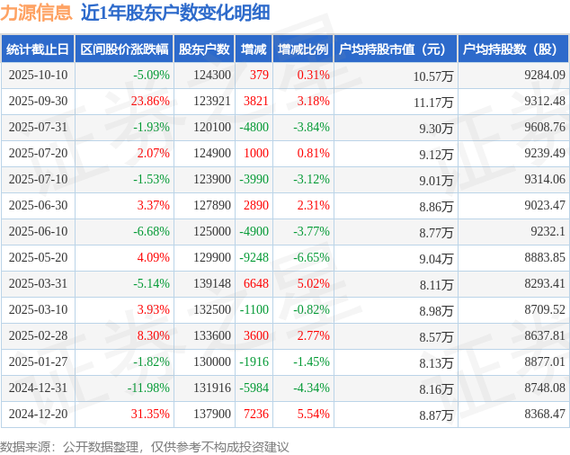 从股价来看,2025年9月30日至2025年10月10日,力源信息区间跌幅为5.09%,在此期间股东户数增加400.0户,增幅为0.32%。