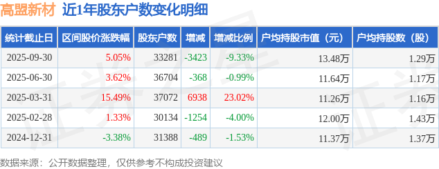 从股价来看,2025年6月30日至2025年9月30日,高盟新材区间涨幅为5.05%,在此期间股东户数减少3423.0户,减幅为9.33%。