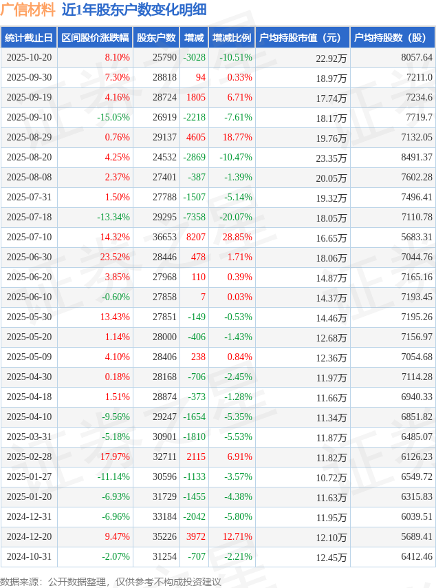 从股价来看,2025年9月30日至2025年10月20日,广信材料区间涨幅为8.1%,在此期间股东户数减少3028.0户,减幅为10.51%。