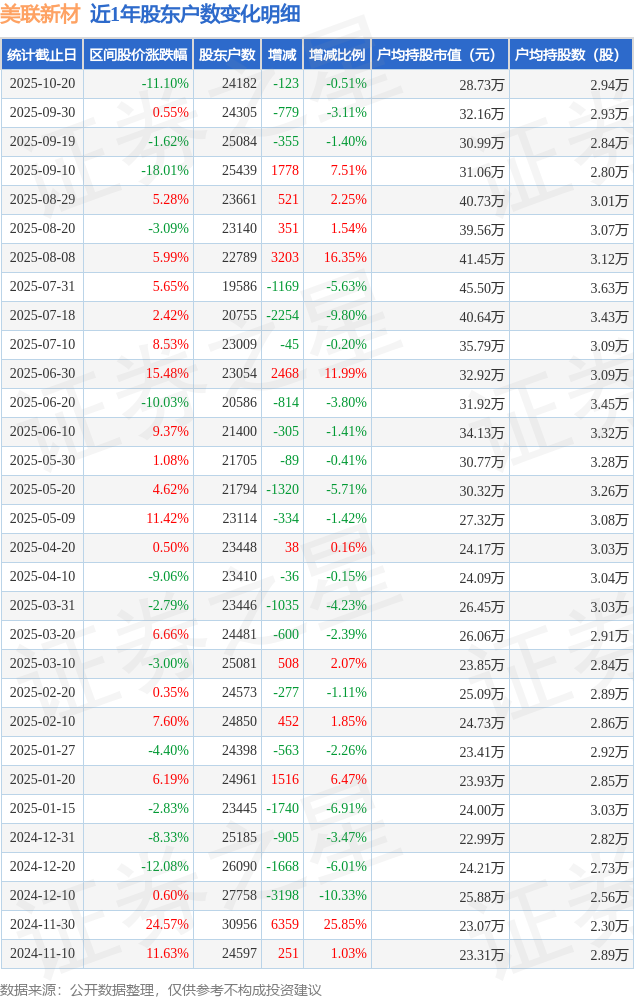 从股价来看,2025年9月30日至2025年10月20日,美联新材区间跌幅为11.1%,在此期间股东户数减少123.0户,减幅为0.51%。