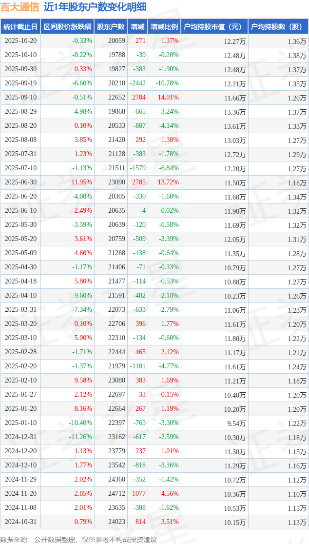 从股价来看,2025年10月10日至2025年10月20日,吉大通信区间跌幅为0.33%,在此期间股东户数增加271.0户,增幅为1.37%。