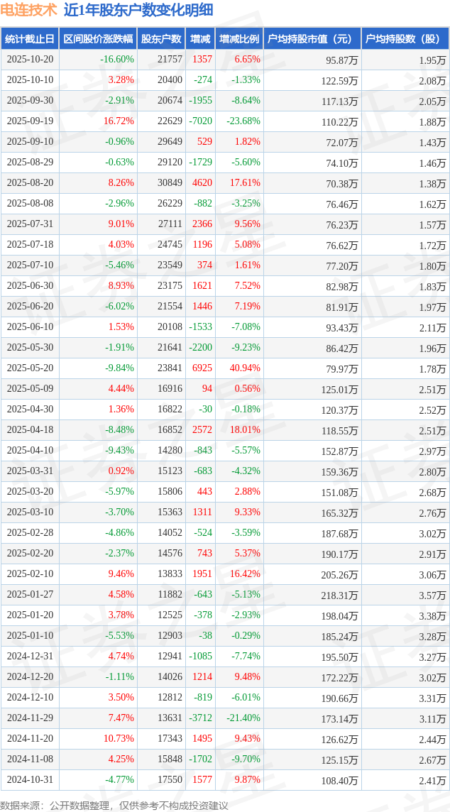 从股价来看,2025年10月10日至2025年10月20日,电连技术区间跌幅为16.6%,在此期间股东户数增加1357.0户,增幅为6.65%。