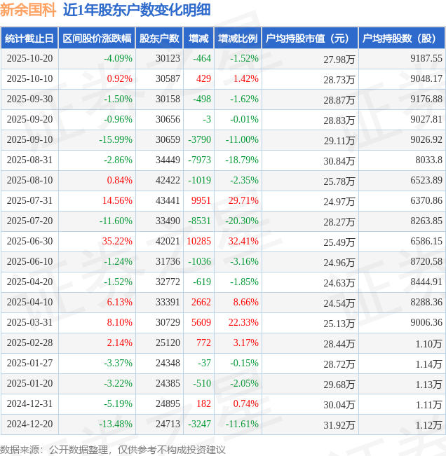 从股价来看,2025年10月10日至2025年10月20日,新余国科区间跌幅为4.09%,在此期间股东户数减少464.0户,减幅为1.52%。