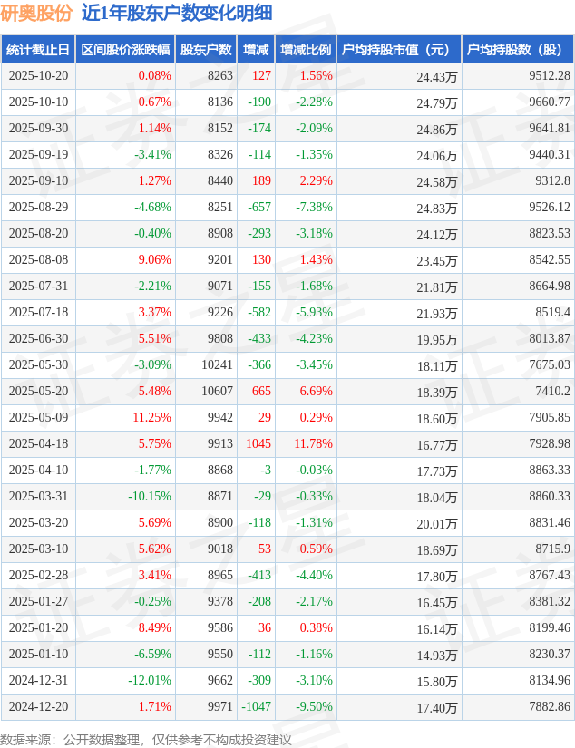 证券之星消息,近日研奥股份披露,截至2025年10月20日公司股东户数为8263.0户,较10月10日增加127.0户,增幅为1.56%。户均持股数量由上期的9661.0股减少至9512.0股,户均持股市值为24.43万元。