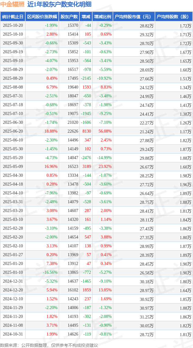 从股价来看,2025年10月10日至2025年10月20日,中金辐照区间跌幅为1.99%,在此期间股东户数减少44.0户,减幅为0.29%。