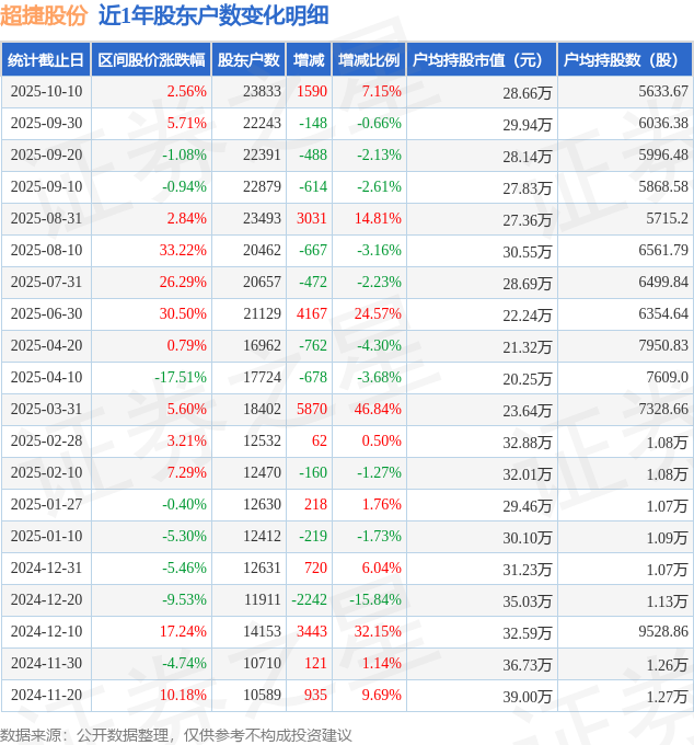 从股价来看,2025年9月30日至2025年10月10日,超捷股份区间涨幅为2.56%,在此期间股东户数增加1590.0户,增幅为7.15%。