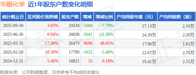 从股价来看,2025年6月30日至2025年9月30日,华融化学区间涨幅为3.03%,在此期间股东户数减少1604.0户,减幅为7.7%。