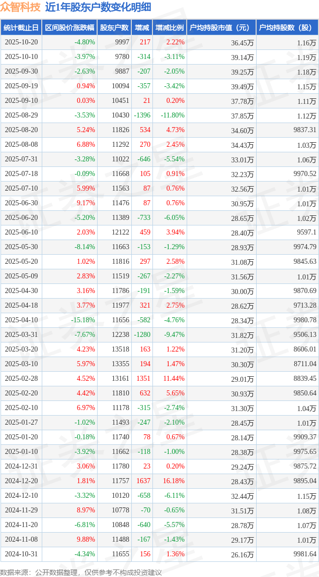 从股价来看,2025年10月10日至2025年10月20日,众智科技区间跌幅为4.8%,在此期间股东户数增加217.0户,增幅为2.22%。