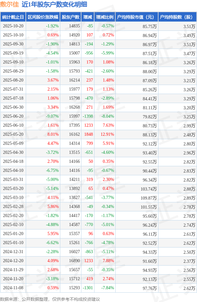 从股价来看,2025年10月10日至2025年10月20日,敷尔佳区间跌幅为1.92%,在此期间股东户数减少85.0户,减幅为0.57%。